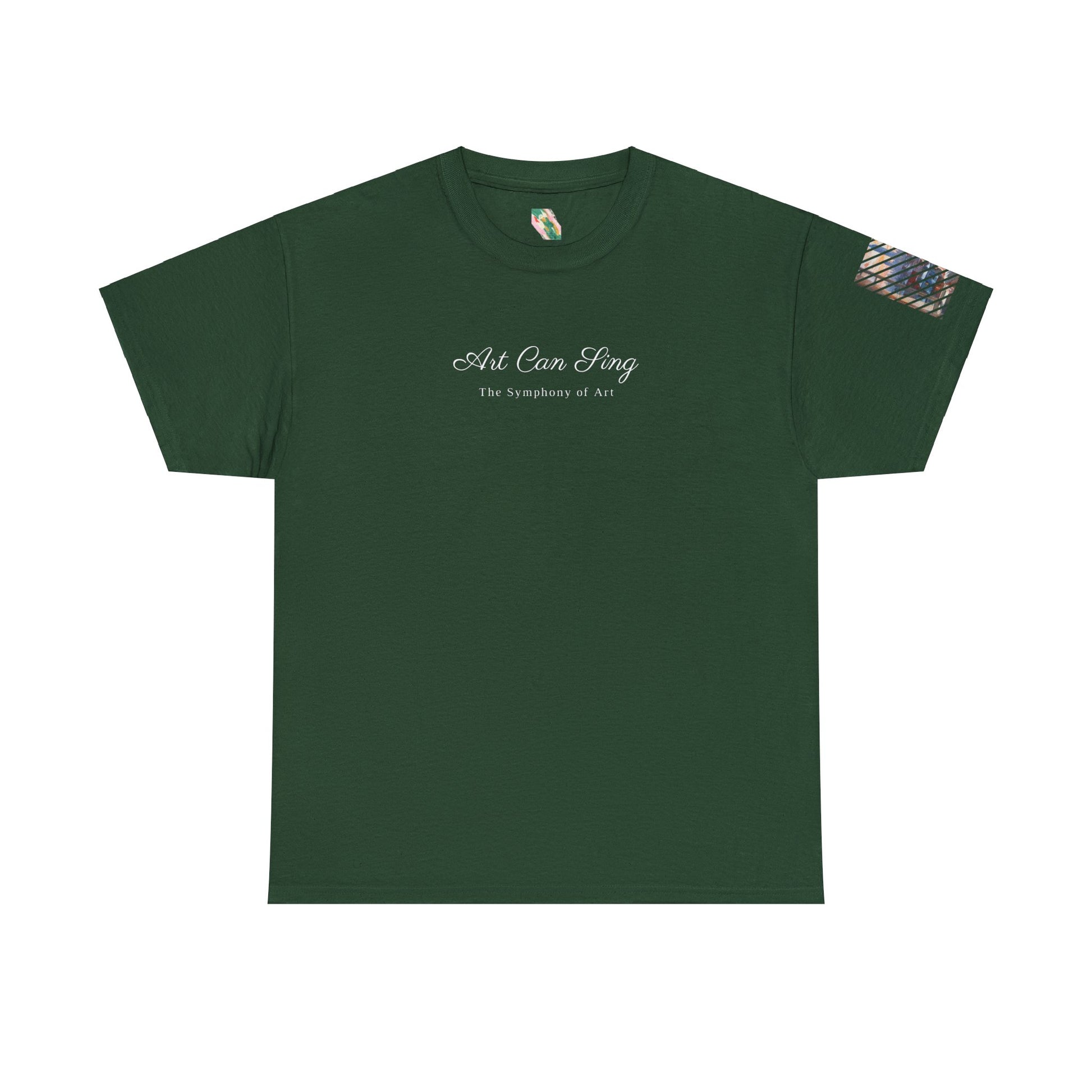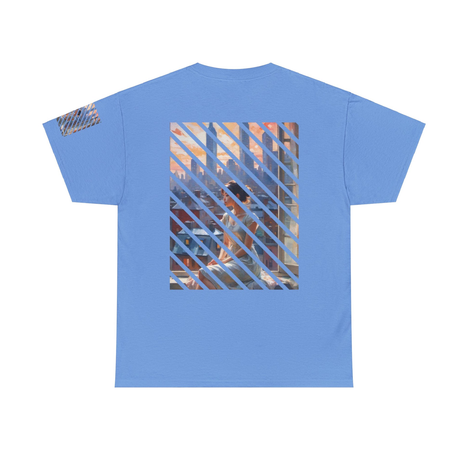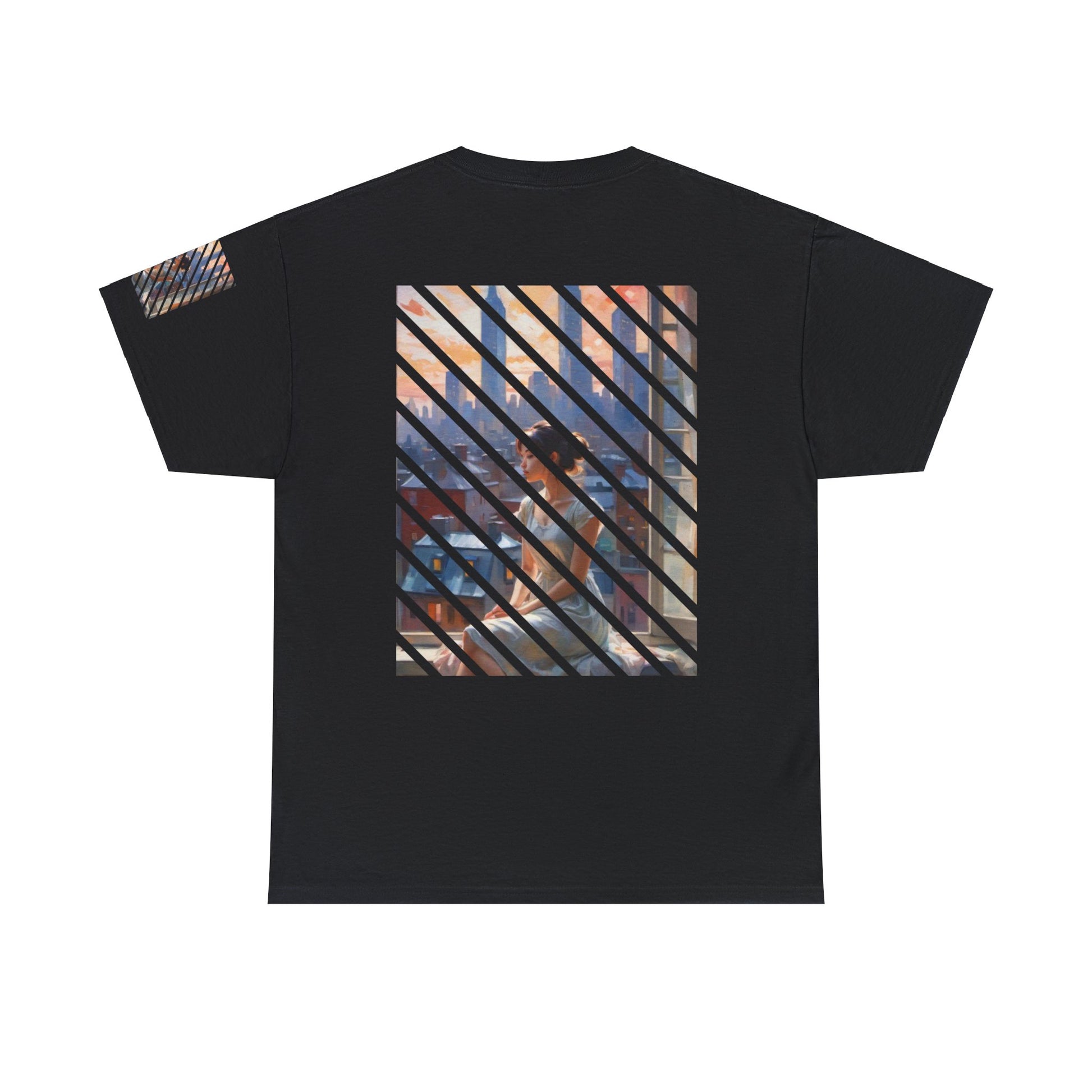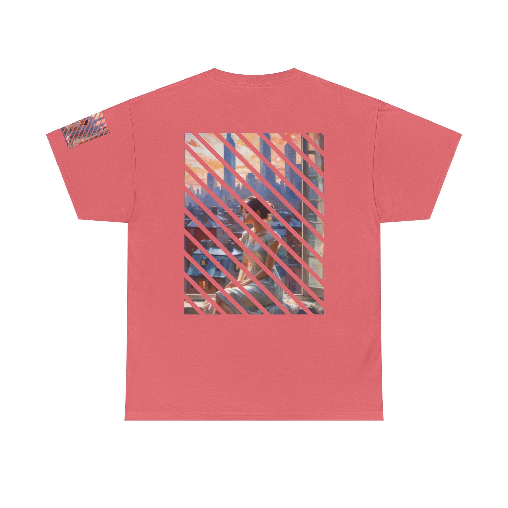 Find moments of calm reflection amidst the city hustle with this urban painting printed on a super soft cotton tee. The woman sitting pensively in the morning light represents cherishing peaceful seconds before the commotion sweeps you away. The detailed cityscape blended into a soothing mood captures that special time to pause and center yourself. This comfortable unisex t-shirt brings a chill vibe to remind you to value restful minutes. Made in the USA from 100% ethically sourced cotton.
