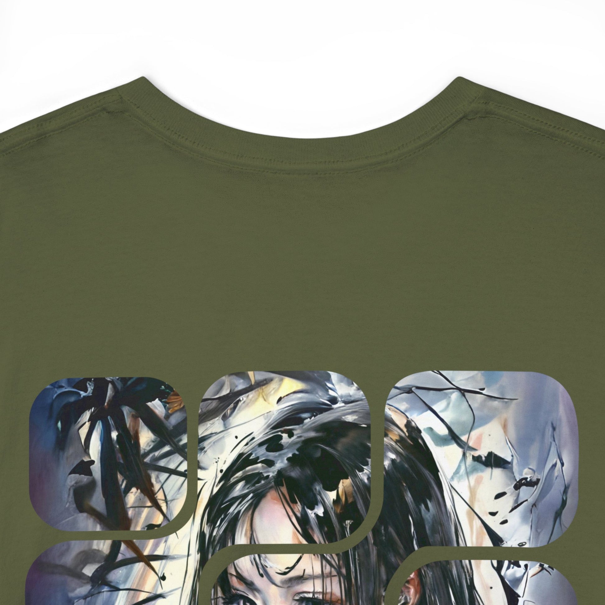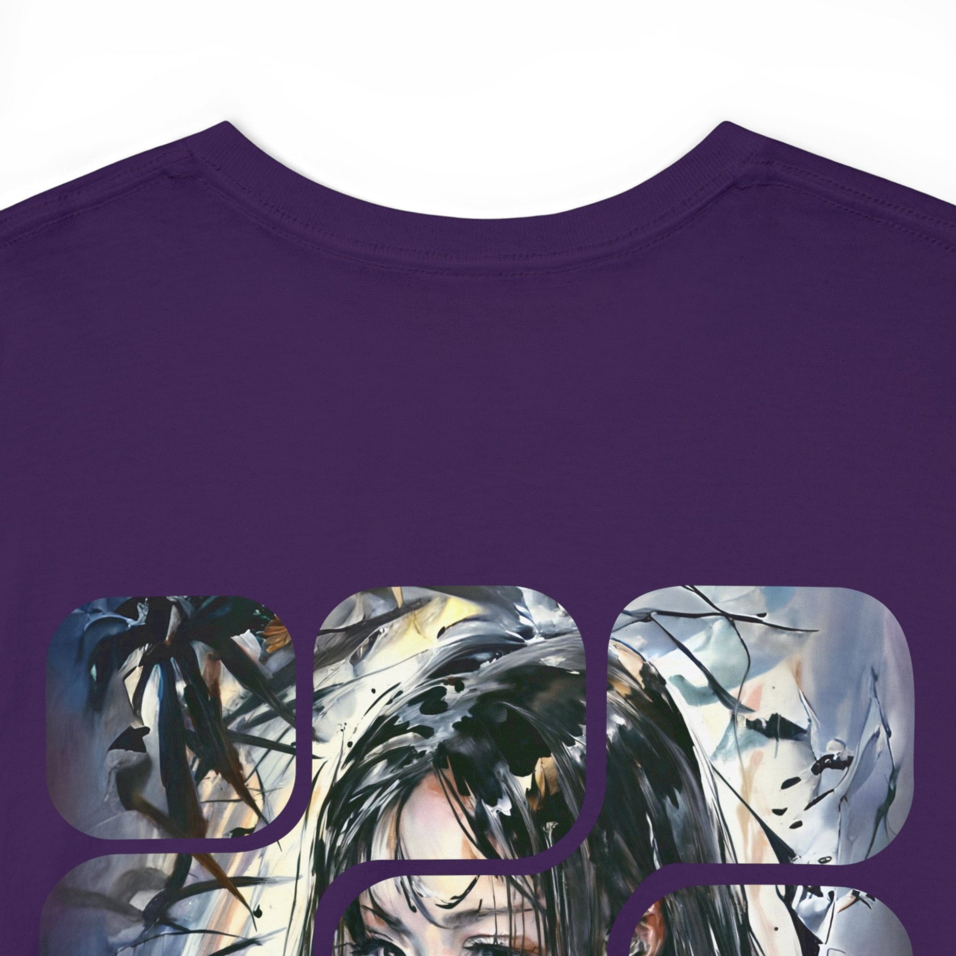 Dare to wear your emotions on your sleeve with this bold, abstract portrait tee. A woman's intense gaze penetrates through cascading raven locks, her furrowed brows and parted lips hinting at the turmoil simmering beneath. Fiery brushstrokes swirl in a vortex around her, reds and oranges clashing with muted shades in a haunting dance of shadow and light. Raw, moody, and utterly captivating - this visceral design plunges you into the depths of unbound human emotion. Make a statement with the powerful, unchained energy of tempestuous beauty emblazoned across your chest.