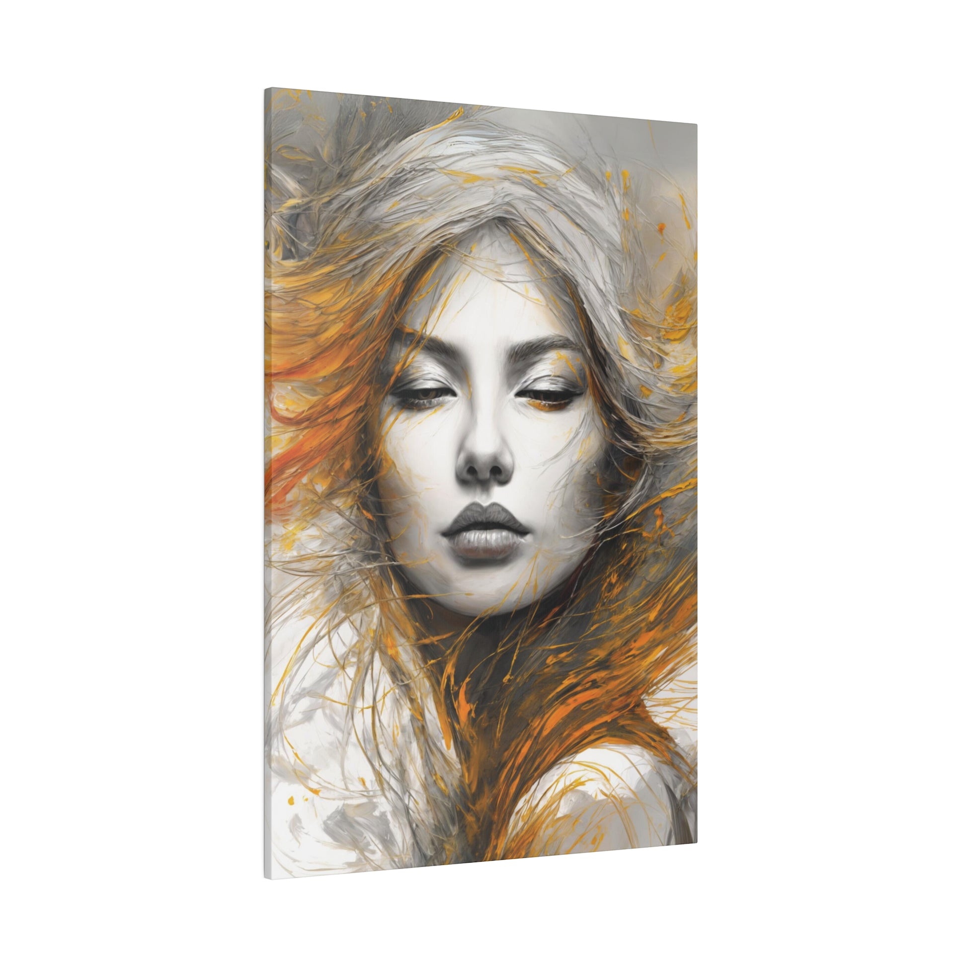 This mesmerizing mixed media canvas print portrays a captivating female face enveloped in swirling strands of fiery auburn and golden hues, reminiscent of flickering flames. Her softly rendered yet striking features, with full lips and eyes serenely closed, emerge from the radiant, abstract wisps dancing across the canvas surface.