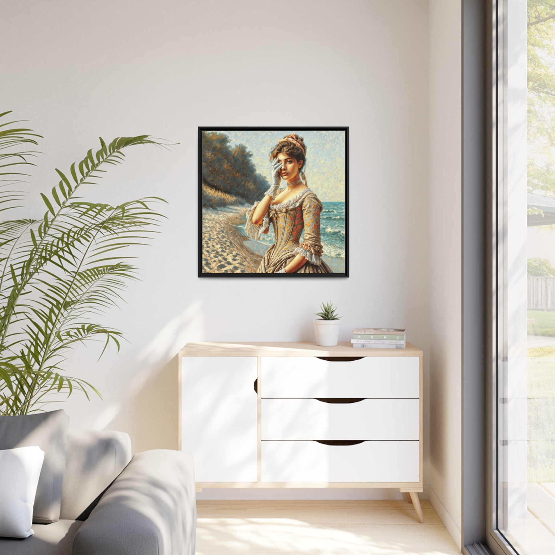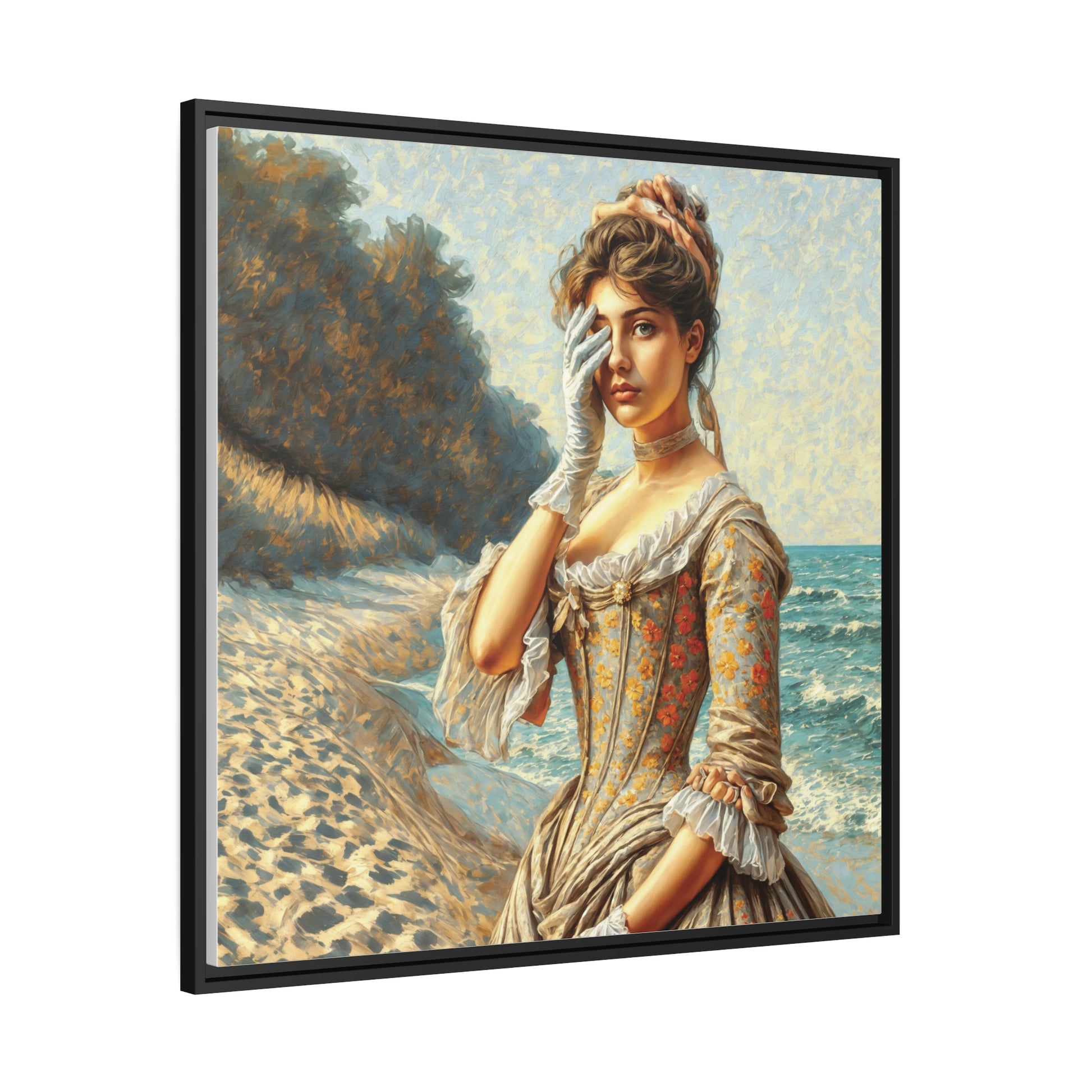 This captivating artwork, created in the style of impressionism portrays a woman from the 1800s standing by the seaside. Her elegant pose, with one hand covering her eye conveys a sense of contemplation or an unspoken secret. The paintings texture is filled with brushstrokes that bring the scene to life evoking a sensation as if one could truly feel the sea breeze through the canvas. By gazing at the viewer she bridges the gap between her era and ours forging a connection that transcends time. As the artist my intention was to capture a moment of introspection that we all experience when we find ourselves alone with the ocean. The rhythmic waves and endless horizon have a way of unlocking something within us and transporting us across time itself. The expression, on this womans face suggests that she is pondering lifes enduring mysteries—questions that still occupy our thoughts today. It is my hope that this painting evokes a timeless sense of connection that we all share.