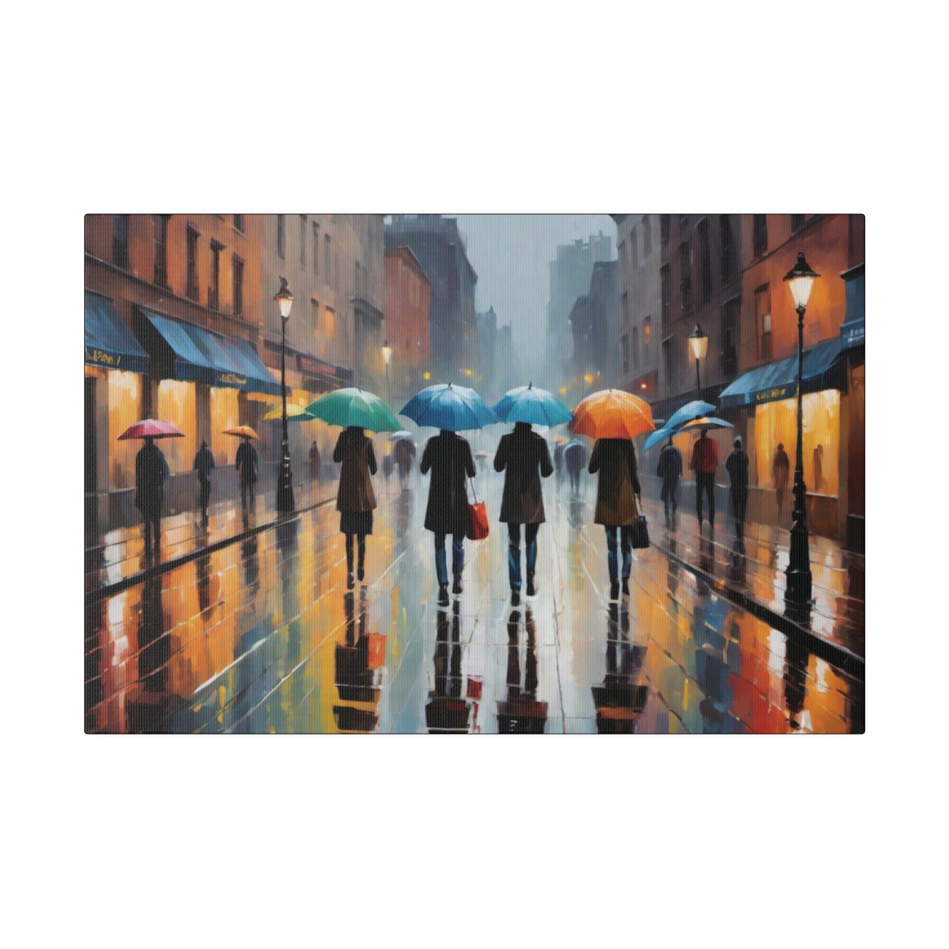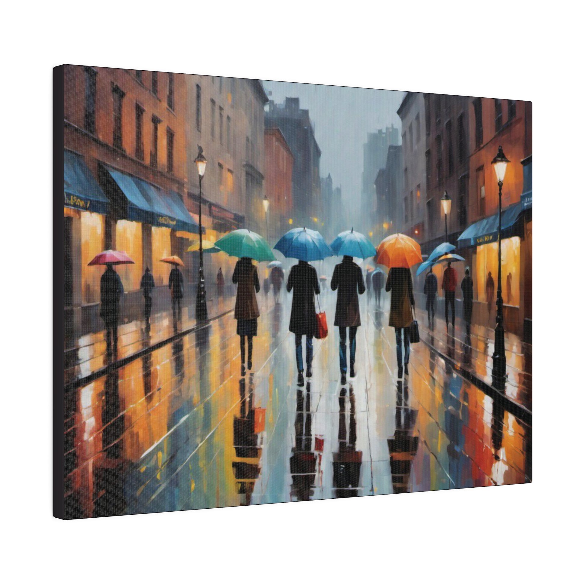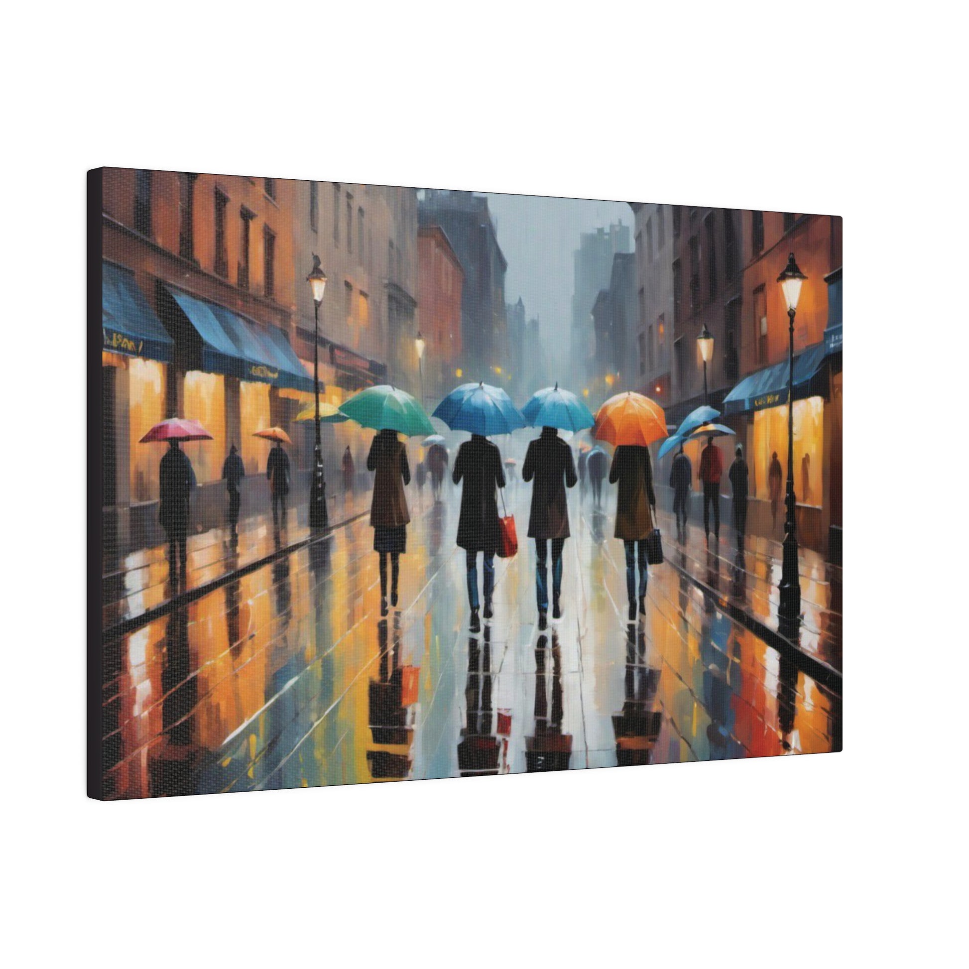 I named this painting 'Melodies of a Rainy Day' as it captures the essence of a city street during an afternoon. The sight of people strolling with their umbrellas reflects the colors of life, against the shimmering pavement. The warm radiance from the shops spills onto the sidewalks beckoning individuals into a realm where the vibrancy of existence persists on rainy days. This frozen moment portrays the dance between city life and illumination akin to a symphony playing amidst rain soaked streets. As an artist my intention was to convey the sensation that arises when precipitation graces the cityscape. The harmonious blend of screeching tires buzzing neon lights and raindrops hitting umbrellas creates a soundtrack! My hope is that this painting inspires individuals to appreciate the beauty, in settings.