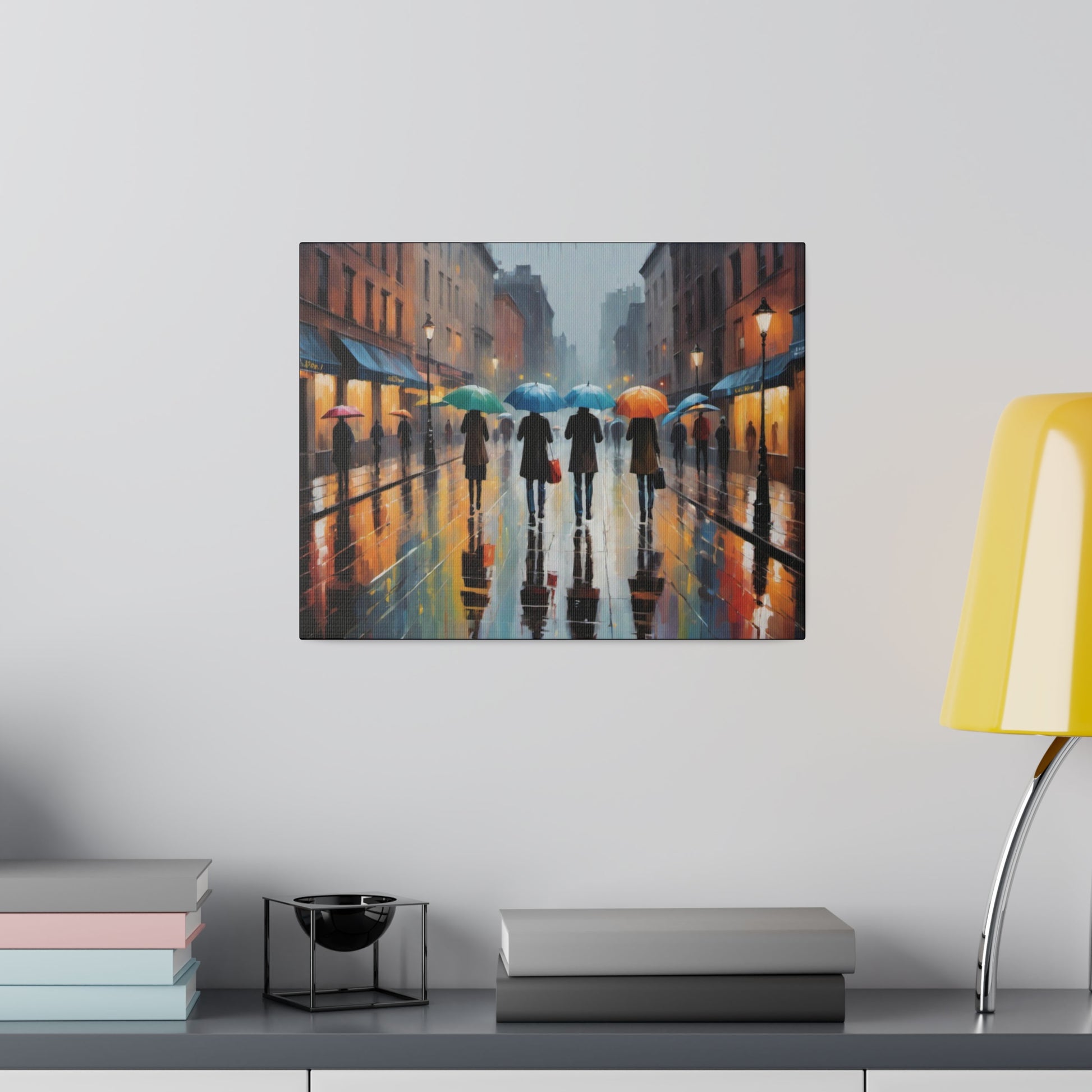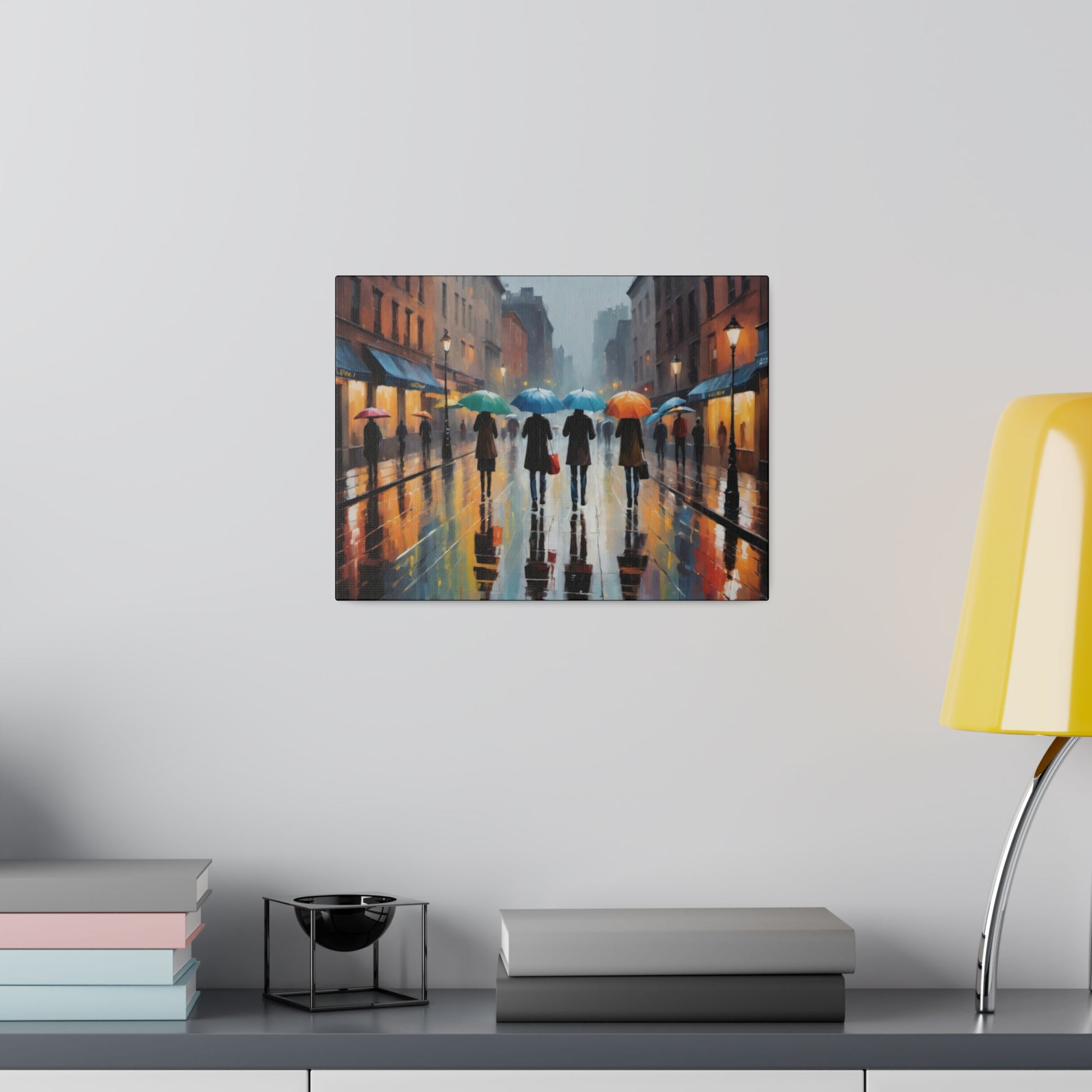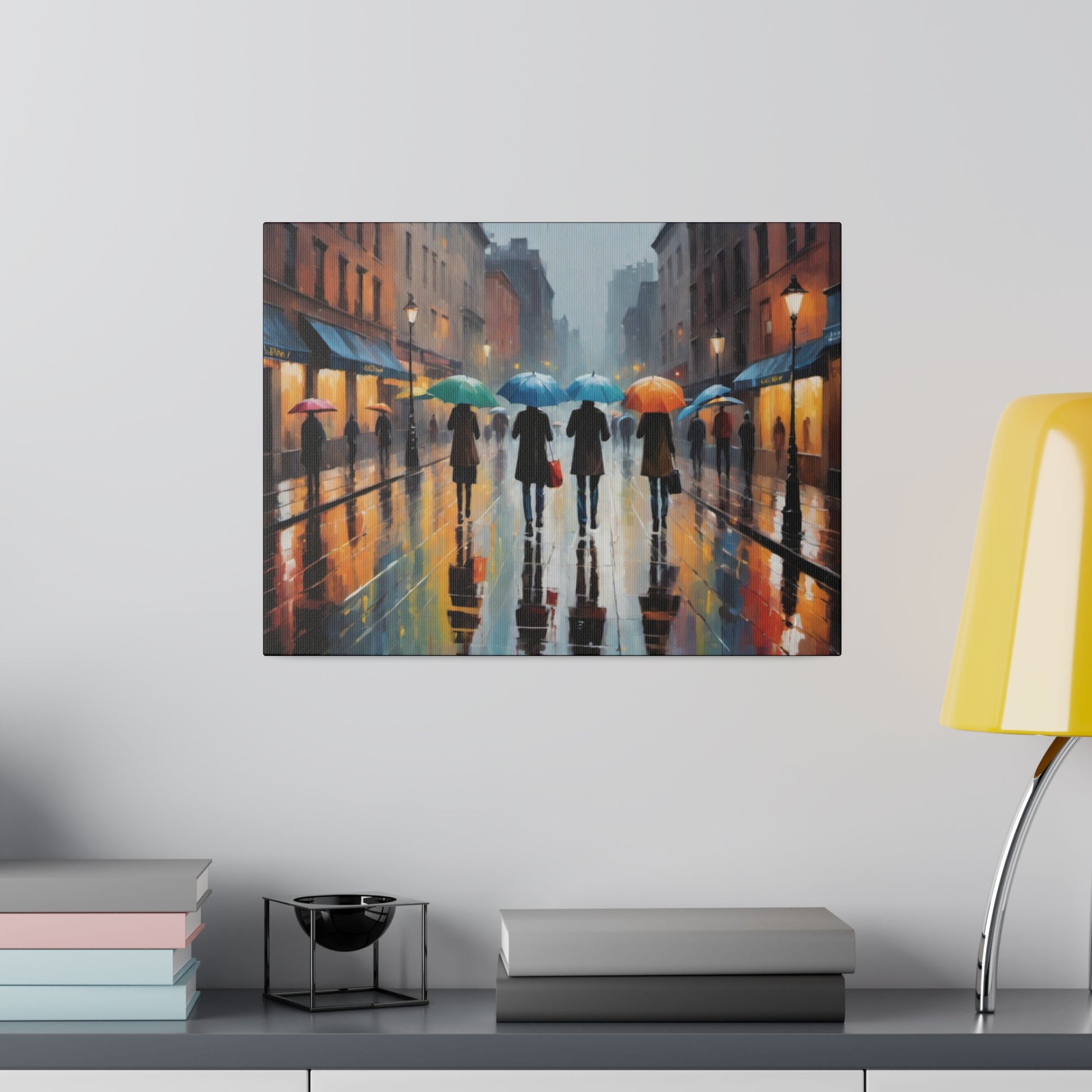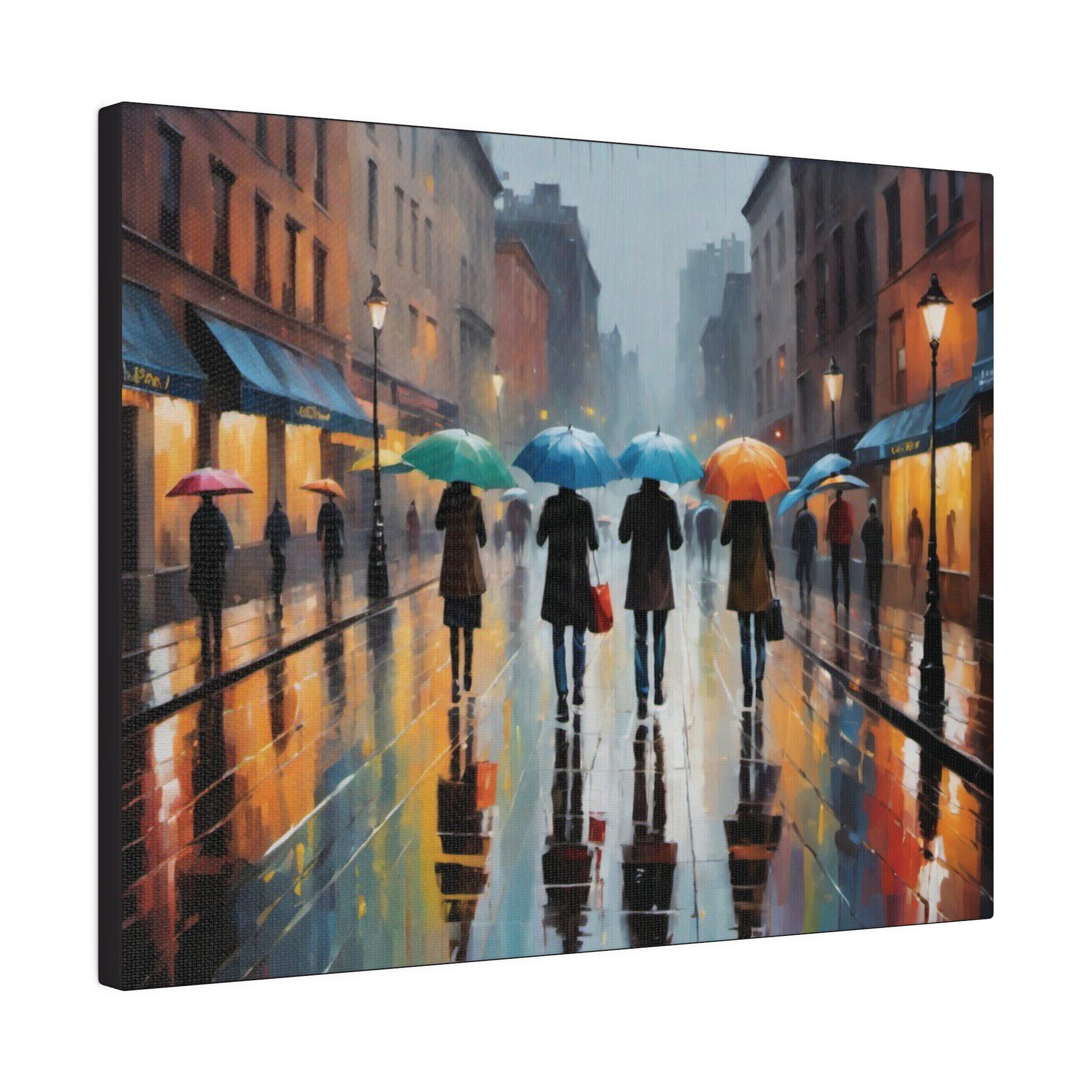 I named this painting 'Melodies of a Rainy Day' as it captures the essence of a city street during an afternoon. The sight of people strolling with their umbrellas reflects the colors of life, against the shimmering pavement. The warm radiance from the shops spills onto the sidewalks beckoning individuals into a realm where the vibrancy of existence persists on rainy days. This frozen moment portrays the dance between city life and illumination akin to a symphony playing amidst rain soaked streets. As an artist my intention was to convey the sensation that arises when precipitation graces the cityscape. The harmonious blend of screeching tires buzzing neon lights and raindrops hitting umbrellas creates a soundtrack! My hope is that this painting inspires individuals to appreciate the beauty, in settings.