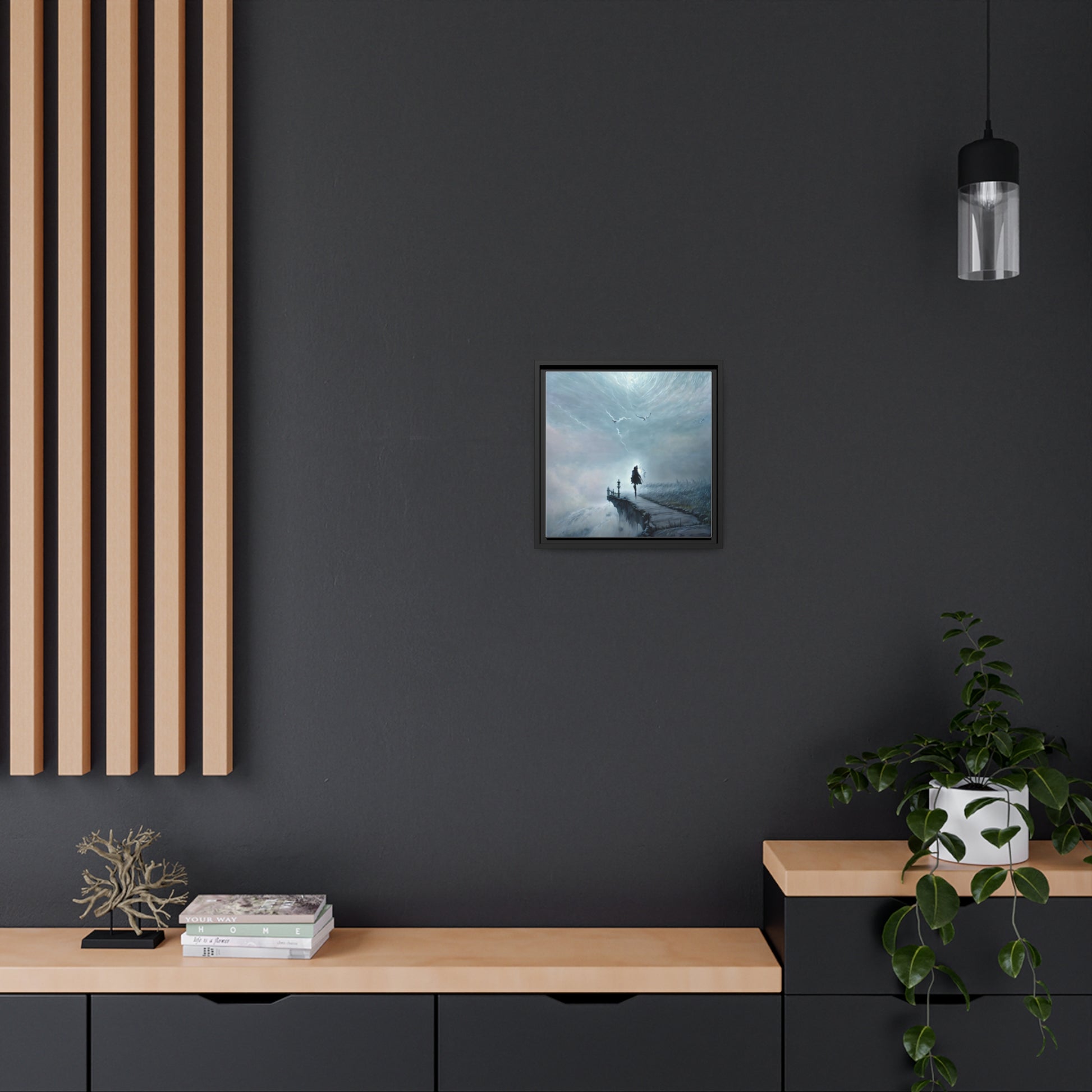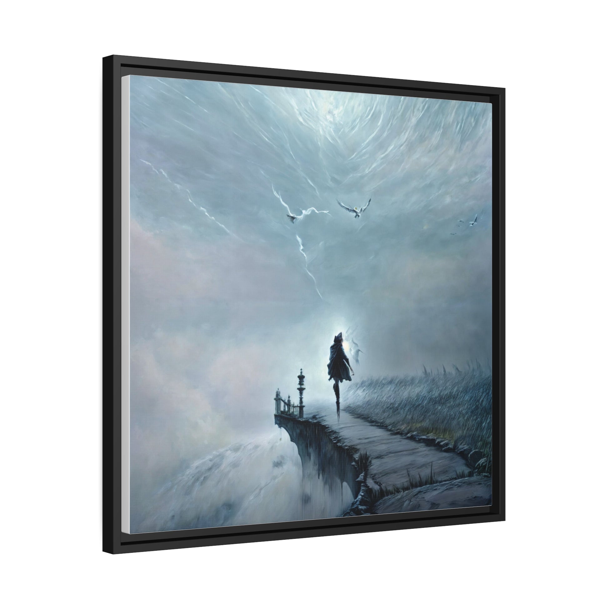 Dive into the ethereal beauty of 'The Journey Beyond,' a mesmerizing painting that encapsulates the essence of an enigmatic journey. A solitary figure, cloaked and mysterious, strides with purpose along a narrow path amidst a surreal and stormy atmosphere. The swirling skies above, painted with masterful strokes of light and shadow, echo the tumultuous waves below. Birds defy the tempest, soaring freely - symbols of hope amidst adversity. This piece is not just a painting but an experience, inviting all of you to transcend the ordinary and venture into a world where every step forward unveils deeper layers of mystery and emotion.