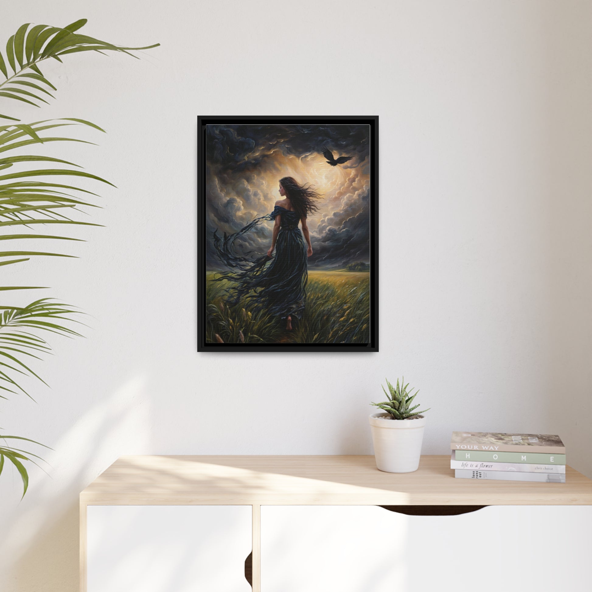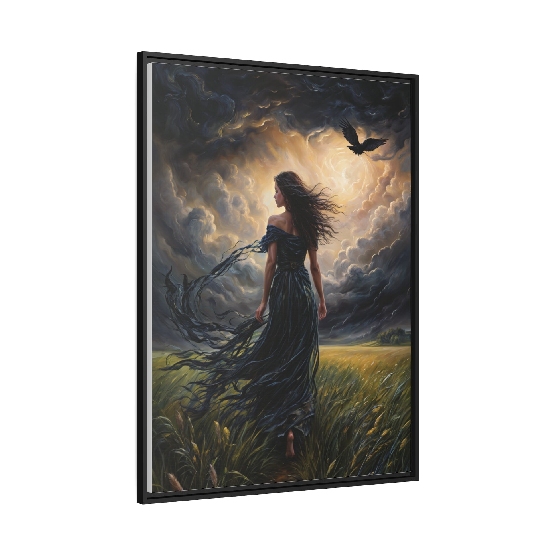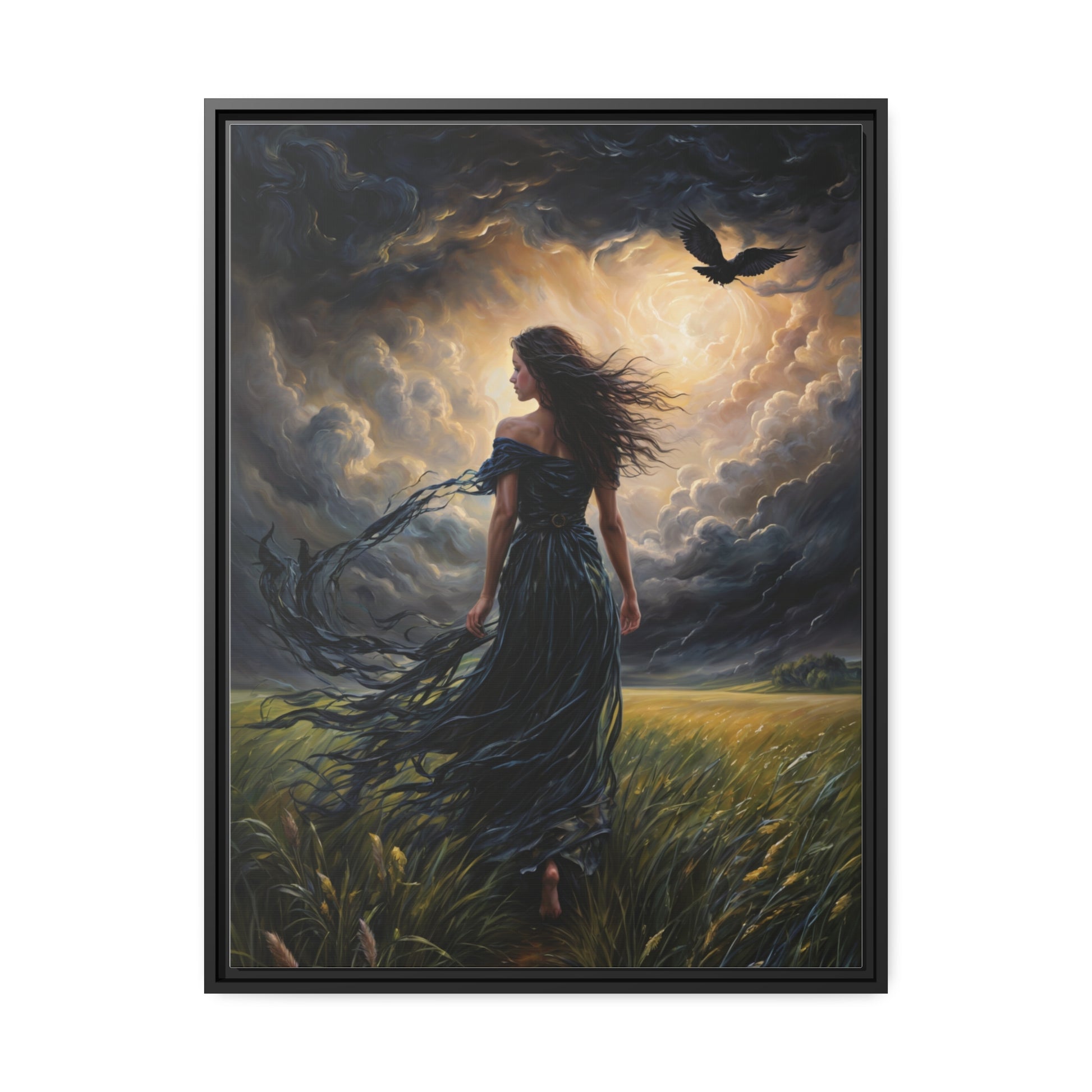 This striking oversized canvas showcases a powerful nature scene with a windswept, flowing female silhouette amidst turbulent storm clouds and a flying raven. The rich colors, intricate brushwork, and intense visual depth create an undeniably eye-catching statement piece for adding moody ambiance to living spaces. Ideal for eclectic decor tastes, this mystic wall art makes a bold accent for living rooms, bedrooms, offices or entryways. Evocative yet open to interpretation, it infuses interiors with mysterious, romantic energy. Premium canvas wrapping and quality inks ensure vivid imagery. Wall-ready hanging for effortless display.